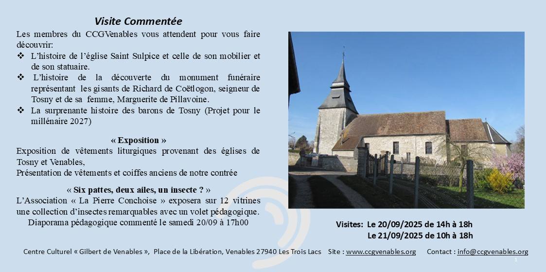 Le CCGVenables propose une découverte de l’église Saint-Sulpice de Tosny, de son mobilier et de ses statues. Sont également présentés : l’histoire des gisants de Richard de Coëtlogon et de son épouse, le récit des barons de Tosny (dans le cadre du projet du millénaire 2027), ainsi qu’une exposition de vêtements liturgiques et de costumes traditionnels. L’association « La Pierre Conchoise » expose une collection pédagogique d’insectes, avec un diaporama commenté prévu le samedi 20 septembre à 17h.